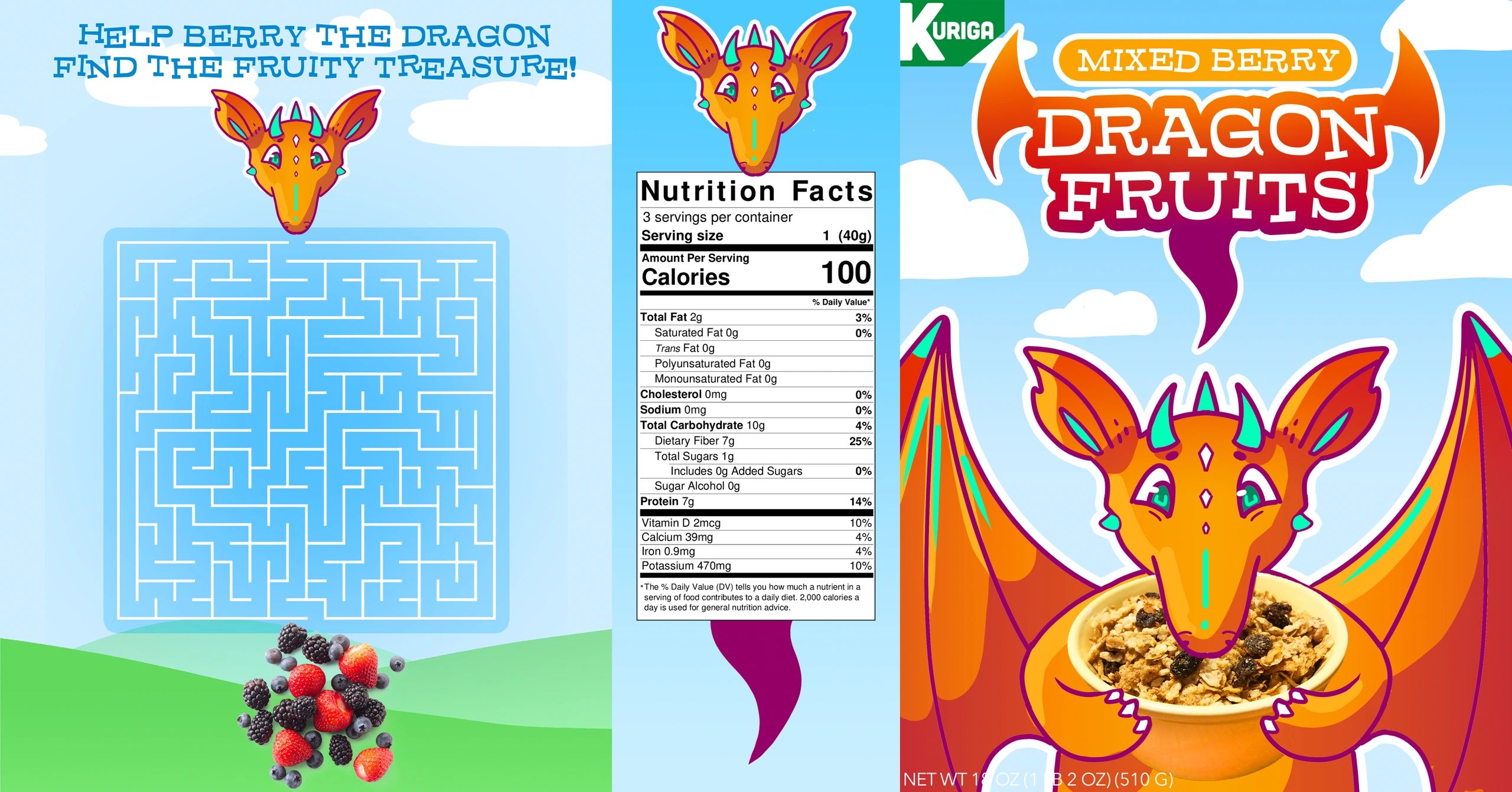 Cereal box design for a kid's cereal named Dragon Fruits.