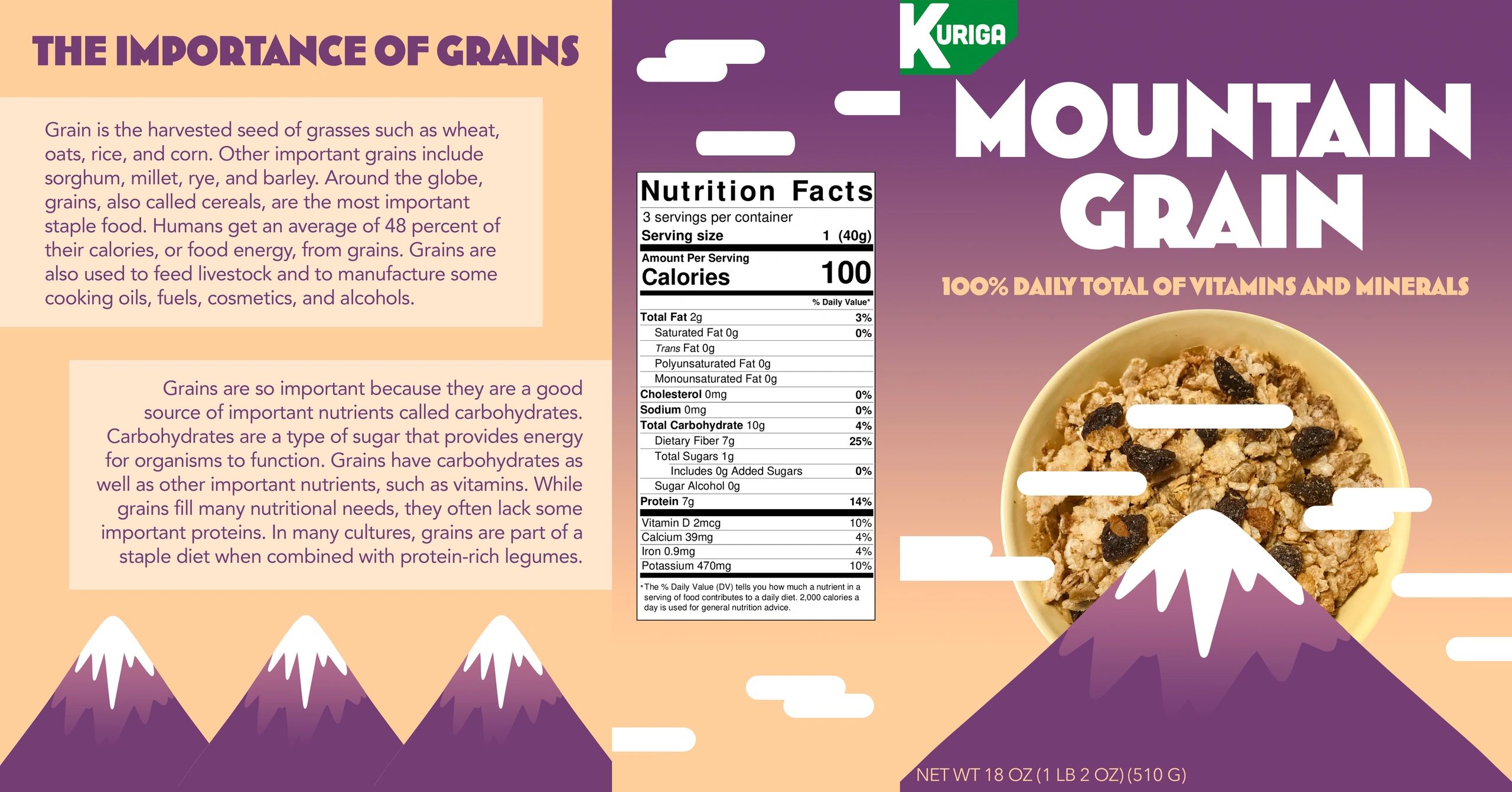 Cereal box design for a cereal named Mountain Grain.